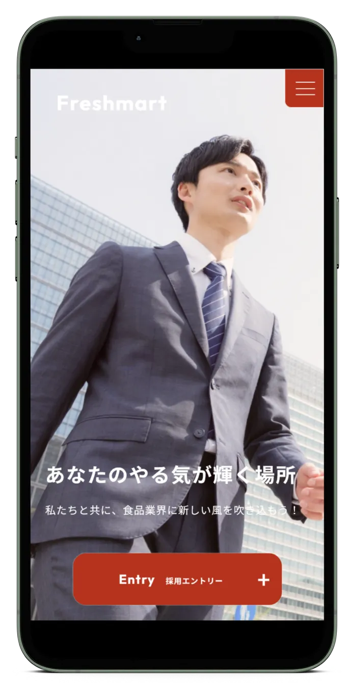 ・ファーストビューで大きなビジュアルを使用し、スーパーで笑顔で働く従業員を見せイキイキとしたエネルギッシュなイメージにしました。