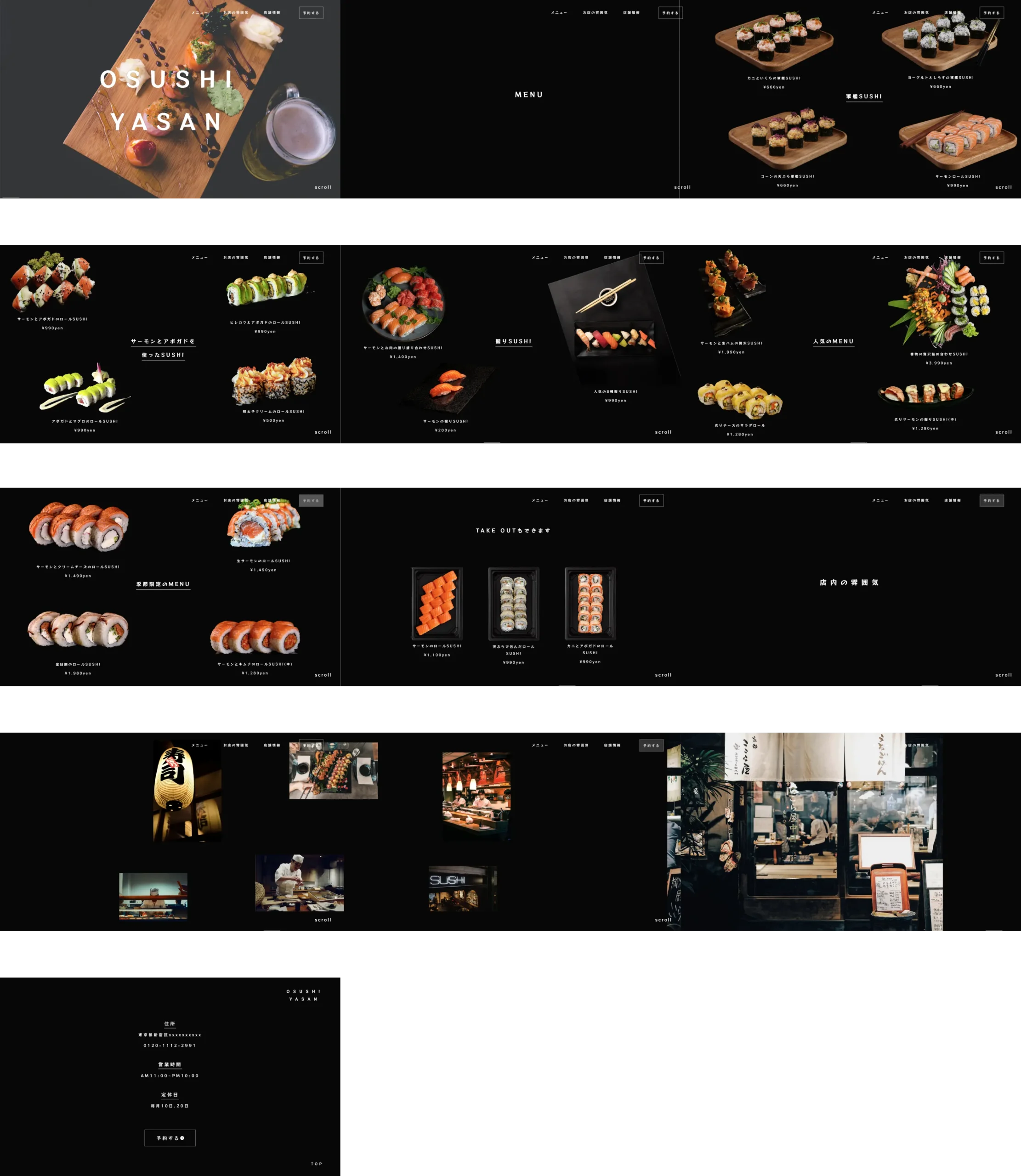 ・寿司店のホームページでは文字を縦書きにしてることが多いですが、洋のイメージを崩さないように敢えて文字は全て横書きにし、印象に残るようにPC版サイトでは横スクロールを取り入れました。