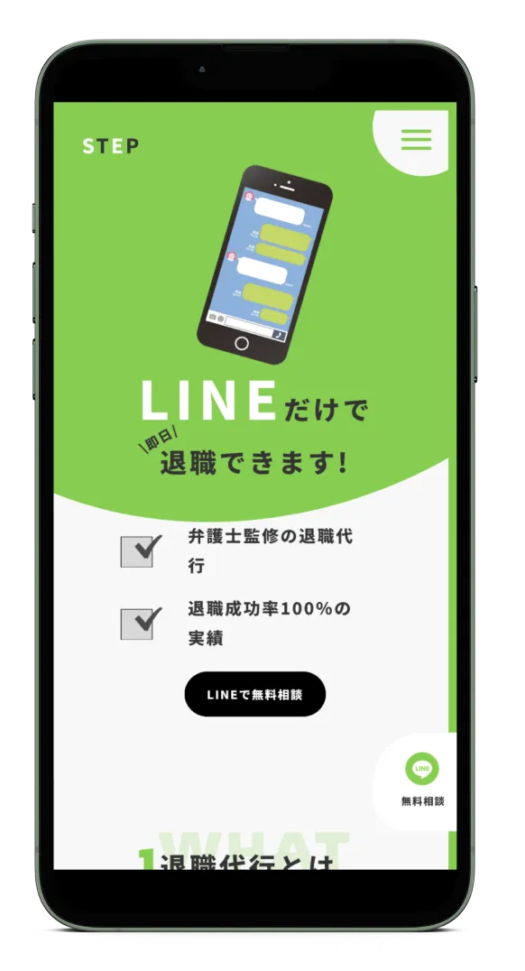 ・"明るい未来をイメージさせる"効果を持つ黄緑色をメインカラーにすることで、他の退職代行サイトにありがちな真面目な雰囲気とは違った明るい雰囲気になるようにしました。